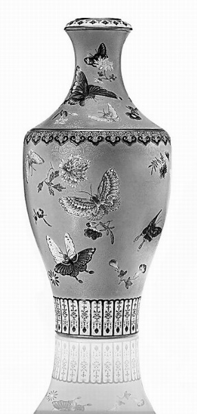 佳士得拍卖公司前不久宣布,将在今年12月初,在香港举行秋季拍卖。拍卖的中国瓷器中,一尊放山居旧藏的清乾隆御制粉红地粉彩轧道蝴蝶瓶格外惹眼。在传世的乾隆御制瓷中,此花瓶为孤品,未见其他相同器物。瓶身修长,造型典雅高贵。图案绘制异常精美,粉釉底子暗刻花纹,用各色珐琅彩绘姿态各异、栩栩如生的蝴蝶,可谓精雕细琢,匠心独运。