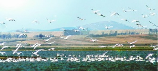 白天鹅在河北沽源县水泉淖嬉戏。近年来,随着“三北”防护林、首都周围绿化、“一退双还”生态治理等工程的实施,河北张家口坝上地区的天然绿色屏障逐渐开始恢复,其中沽源县林草覆盖率达到70%以上,生态环境日渐好转。自2005年以来,每逢春暖和秋寒的两个季节,数以万计的天鹅来到水泉淖、囫囵淖等五个天然淖泊栖息。 本报记者 雷汉发摄