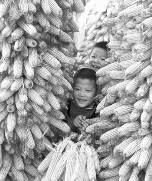 10月16日,山东临沂市沂南县砖埠镇两名孩子在玉米垛间玩耍。今年临沂市玉米又获丰收,村民把玉米挂满庭院,形成农家独特的秋收美景。 杜玉葆摄(中经网供图)