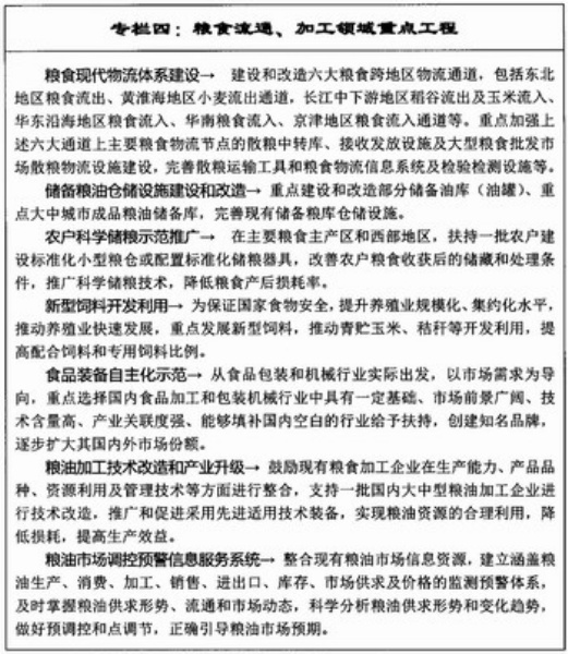 加强粮食物流体系建设。编制实施粮食现代物流发展规划,推进粮食物流“四散化”变革。加快改造跨地区粮食物流通道,重点改造和建设东北地区粮食流出、黄淮海地区小麦流出、长江中下游地区稻谷流出以及玉米流入、华东地区和华南沿海地区粮食流入、京津地区粮食流入等六大跨地区粮食物流通道。在交通枢纽和粮食主要集散地,建成一批全国性重要粮食物流节点和粮食物流基地。重点加强散粮运输中转、接收、发放设施及检验检测等相关配套设施的建设。积极培育大型跨区域粮食物流企业。大力发展铁海联运,完善粮食集疏运网络。提高粮食物流技术装备水平和信息化程度。