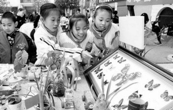 11月13日,湖北省南漳县实验小学学生在校园里举行的科技周活动现场欣赏展品。