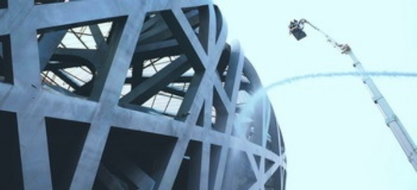 11月14日,消防车使用高压水枪对“鸟巢”钢结构进行清洗。当日上午,国家体育场“鸟巢”钢结构接受了北京奥运会结束后的第一次大规模全面清洗。奥林匹克中心区消防支队出动了两辆消防车,使用高压水枪进行清洗作业,预计整个清洗工作需要大约一个星期。 新华社发