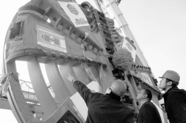 11月16日,地铁大兴线义和庄车站施工现场,工作人员正在安放盾构机刀盘,这标志着北京地铁大兴线工程全面开工建设。大兴线连接北京市区和大兴区新城,全长21.8公里,计划于2010年12月通车运营。本报记者 赵晶摄