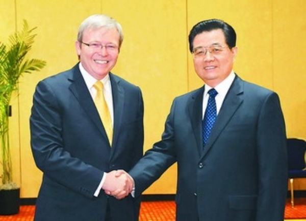 胡锦涛表示,中澳关系呈现健康迅速发展的良好势头。双方相互理解和信任不断加深,经贸、能源资源、环保、科技、教育、文化、执法、旅游等各领域互利合作成果显著。双边贸易增长迅速,特别是自由贸易协定谈判稳步推进。双方在气候变化、国际金融危机等重大国际问题上保持密切沟通和协调,共识和合作日益增多。在当前国际社会面临诸多全球性挑战的形势下,深化中澳全面合作关系面临前所未有的机遇,前景十分广阔。中方始终从战略高度和长远角度看待和发展中澳关系,愿同澳方一道,在相互尊重、平等互利的基础上,保持高层交往,加强交流和对话,深化互信和合作,不断开创中澳关系新局面。