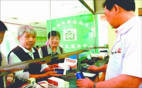 | 长沙芙蓉区马王堆社区卫生服务中心,彭瑞明老人(左)用社区发放的“医疗补助卡”领药。该区不断加大医疗优惠措施,对低保户以家庭为单位,每年每户发放100元的医疗补助卡,很受低保户的欢迎。 |