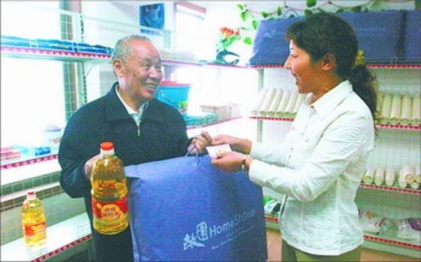 | 长沙市开福区捞刀河社区博爱超市,居民持卡领取生活用品。捞刀河社区在长沙率先推出为困难群众服务的“社区一卡通”,用卡可以在各个服务站点享受到相应价值的居家服务,资金全由社区投入。“一卡通”每个季度都发放一次,最大限度地将社区的困难群众纳入服务范围。