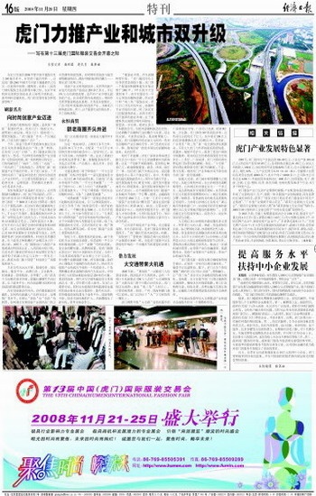 虎门服装产业已达到产业集群的规模,产业配套体系比较成熟,形成了完善的设计、生产、销售一体化服装产业结构网络,具有显著的区域经济特色。获得了“国家火炬计划东莞虎门服装设计特色产业基地”、“广东省产业集群升级示范区”、“最具行业影响力专业展会”、“最具行业影响力纺织之都”和“最具影响力专业市场”等称号,2006年被中国纺织工业协会授予“中国女装名镇”荣誉称号。