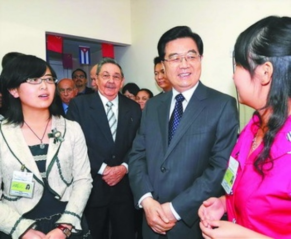 胡锦涛抵达学校的“蜂鸟校区”,受到专程前来的古巴国务委员会主席兼部长会议主席劳尔·卡斯特罗、国务委员会第一副主席兼部长会议第一副主席马查多等古巴领导人的热情迎接。