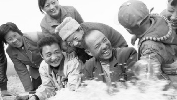 2007年底,山东沂南县湖头镇黑牛石村农民看着引上山岭的清水笑开颜。 杜玉葆摄(中经网供图)