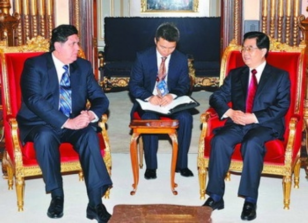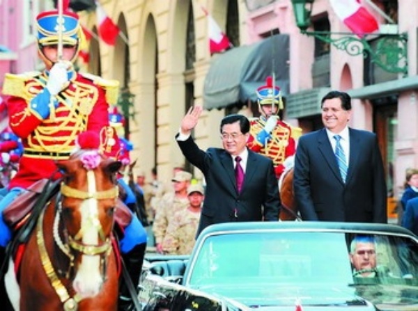 胡锦涛指出,今年以来,中秘关系又有了新的进展。两国高层交往密切,政治互信增强;经贸合作不断扩大,中秘自由贸易协定谈判已经完成;两国《2008—2011年度文化交流执行计划》正在有效落实,两国有关部门和院校已就在秘鲁建立3所孔子学院达成一致;在国际和地区事务中,双方保持密切磋商和配合。我们对两国关系发展取得的成果感到满意。