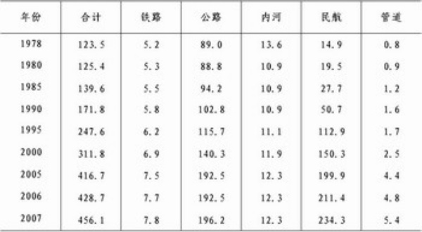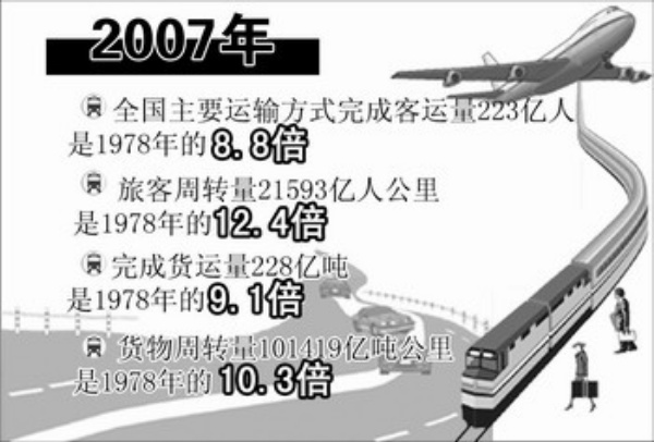 随着改革开放的不断深入和经济的发展,交通运输基础设施不断完善,旅客和货物运输量和周转量迅速增长。 2007年全国主要运输方式完成客运量223亿人、旅客周转量21593亿人公里,分别是1978年25.4亿人和1743亿人公里的8.8倍和12.4倍,年均分别增长7.8%和9.1%;完成货物运输量228亿吨、货物周转量101419亿吨公里,是1978年24.9亿吨和9829亿吨公里的9.1倍和10.3倍,年均分别增长7.9%和8.4%。