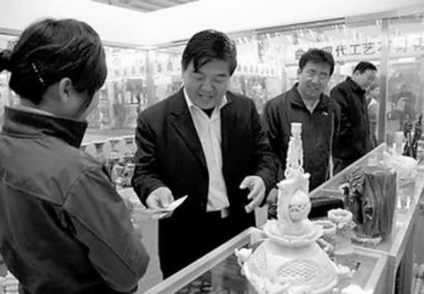 河北曲阳县是著名的雕刻之乡。近年来,该县通过实施全民创业和产业升级,共发展雕刻业户2650家,从业人员达到3.5万人,产品远销87个国家和地区,年产值突破12亿元。图为顾客在精品雕刻店中购买产品。本报记者 宋美倩 通讯员 李秀哲摄