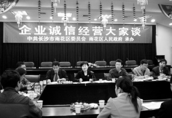 雨花区委常委、宣传部部长张熙坤代表区委、区政府在座谈会上说,《经济日报》开展的“企业诚信经营大家谈”大讨论对企业、对消费者、对社会而言都是一场及时雨。雨花区自1996年建区以来,经济发展很快,人说雨花区是“三湘第一区”,财政收入连续几年在长沙市5区位列第一,非税收入列第一,非税收入仅占财政总收入的11.2%。雨花区更享有“湖南市场看长沙,长沙市场在雨花”的美名。雨花区委、区政府提出了打造“诚信雨花”、铸就“诚信文化”品牌的目标。