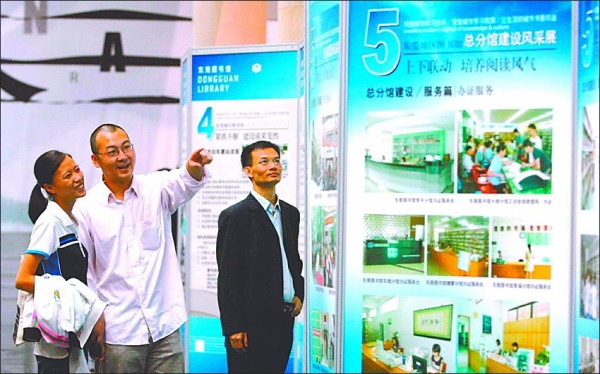 东莞市图书馆,读者正在展示区参观。近年来,该市不断完善公共文化服务体系,图书馆、大剧院、展览馆、群众艺术馆等文化设施相继落成,为建设“文化新城”提供了保障。