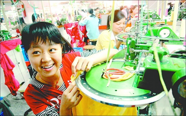 东莞市大朗镇茂荣集团员工魏亚妹(前)对这里的工作环境很满意:“企业的管理非常人性化,在这里工作不仅工资有保障,还能学到很多新知识。”