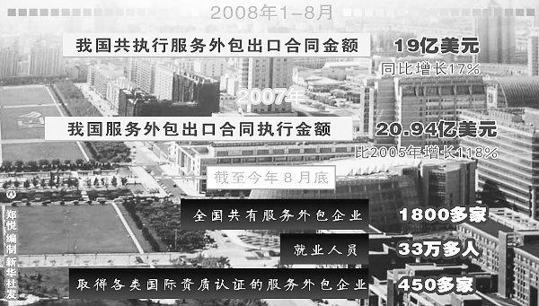 记者从研讨会上了解到,全球服务外包产业持续增长,中国服务外包产业快速发展。截至2007年底,我国有25万多服务外包从业人员。今年1至8月,我国共执行服务外包出口合同金额19亿美元,比去年同期增长17%,从业人员也增至33万。值得注意的是,我国服务外包产业产业规模小,产业集聚度低,亟待树立“中国服务”品牌的国际影响力。