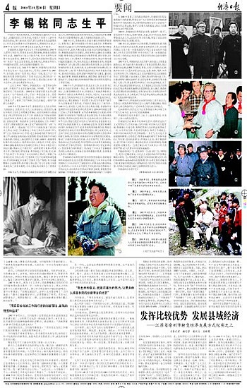 李锡铭同志的一生,是革命的一生,战斗的一生,光辉的一生,是为人民解放事业、为社会主义建设和改革开放事业鞠躬尽瘁的一生。他的逝世,是我们党和国家的重大损失。他的革命精神、高尚品德永远值得我们学习。我们要化悲痛为力量,更加紧密地团结在以胡锦涛同志为总书记的党中央周围,为夺取全面建设小康社会新胜利而努力奋斗。