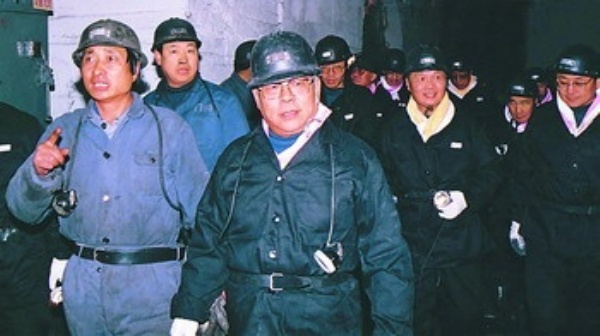 图⑤ 1989年3月31日,时任中共中央政治局委员、北京市委书记的李锡铭同志,在北京矿务局门头沟煤矿300米井下,看望作业工人,了解生产、安全情况。
