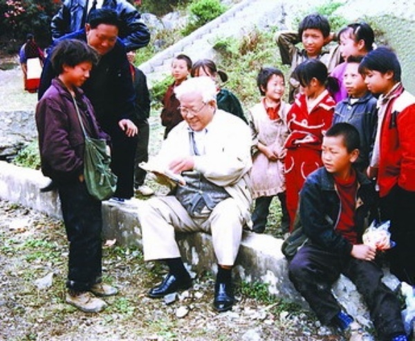 图⑥ 1996年4月,时任第八届全国人大常委会副委员长的李锡铭同志,在贵州考察工作时与孩子们交谈。