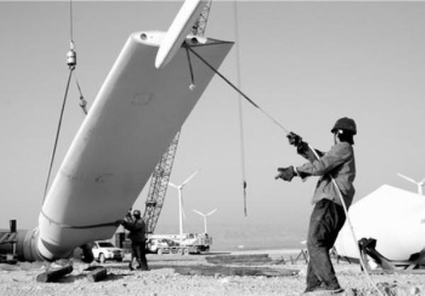 11月26日,施工人员在新疆吐鲁番风力发电场吊装风机。