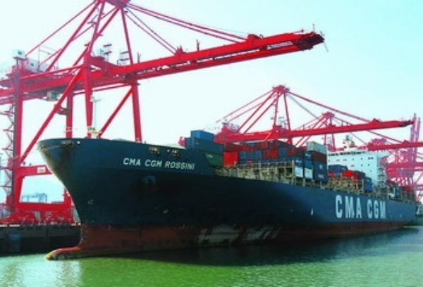 11月30日,一艘大型船舶停泊连云港港集装箱码头装载集装箱。