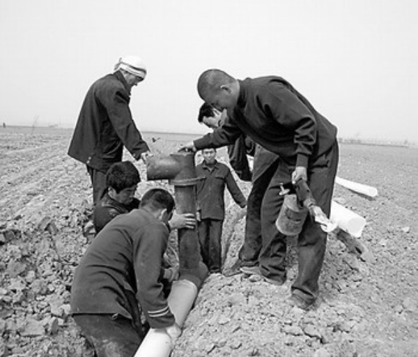 河北省广平县大力实施水土高效利用项目施工,该县已投入农业开发资金5300多万元,铺设地下防渗管道860多公里,每年节水2200万立方米,使2000多亩土地得以恢复种植利用。图为该县农民正在进行防渗管道施工。本报记者 雷汉发 通讯员 商翟摄影报道