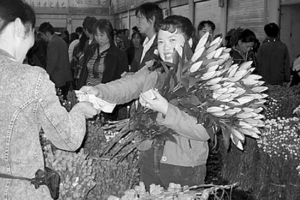 38岁的王永伟是斗南村最早种花的几个人之一。1992年,在自己的两亩地上,王永伟开始了他的种花尝试。开始种植的是玫瑰和康乃馨。收获之后,王永伟和同伴骑着自行车去昆明街头叫卖。这样叫卖的市场毕竟有限,王永伟种的花在本地卖不完,就踏上了去省外卖花的旅途,第一站是广州。