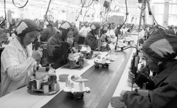 图为江西省最大的玩具制造出口企业龙南县勤业工业公司玩具生产场景。