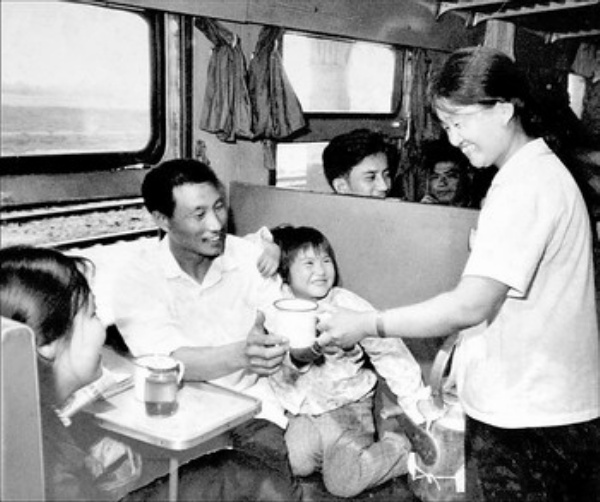 今年57岁的焦玉珍,原北京列车段京沪一组列车员,是北京到上海的第一代列车客运员。尽管已经退休,但30年前奔跑在京沪线之间的情景,焦玉珍依然记忆犹新:1978年,从北京到上海,每天只有一个车次,要经过19个小时才能到达上海,列车时速在60公里左右。当时,全国铁路运营里程只有5万多公里,客流量却高达8亿多人次。由于列车内常常超员,在车上为旅客送水都是件困难的事。7.5公斤的水壶提在手里,一节车厢送下来要打五六壶水才够。