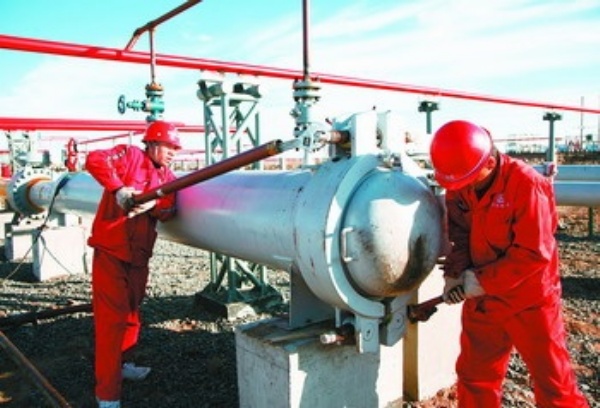 来自吉林省相关部门的数据显示,中国石化今年三大重点项目之一的松南气田一期工程已实现每天向吉林省长春、吉林、四平、公主岭等城市平稳输送天然气30万立方米,这些城市今冬居民和工业供气紧张局面初步得到缓解。图为施工人员在安装设备。新华社记者 马扬摄