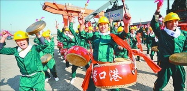 2008年10月29日,营口港务集团的员工们敲锣打鼓,庆祝首班至东欧的国际集装箱船启运。目前,营口港的集装箱航线已覆盖沿海主要港口,并开通了数条国际班轮航线。 李 舸摄