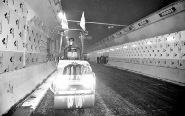 12月11日,一辆工程机械车在隧道内处理铺设沥青的路面。 当日,武汉长江隧道左线工程开始道路路面铺设沥青,这标志着“万里长江第一隧”基础施工全面完成,安装装修工程进入尾声。地处武汉长江大桥和长江二桥之间的武汉长江隧道,全长3609米,为双向4车道,总投资超过17亿元,是目前我国地质条件最复杂、工程技术含量最高、施工难度最大的江底隧道工程。