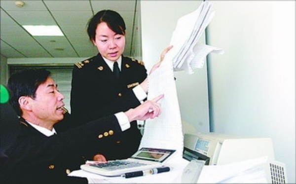 先后荣获全国依法统计先进个人、全国海关统计工作先进个人等称号的南京海关统计处副处长唐仁军(左),正在认真审核海关进出口报关单检控过录表。多年来,南京海关始终坚持从严治关,努力培养爱岗敬业、廉洁奉公、精通业务的海关队伍。