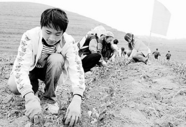 12月10日,在贵州省水城县龙场乡鱼塘村的一个无公害茶叶基地,从浙江绍兴打工返乡的民工张建(左一)通过培训后正在种植茶叶。 新华社记者 杨 楹摄