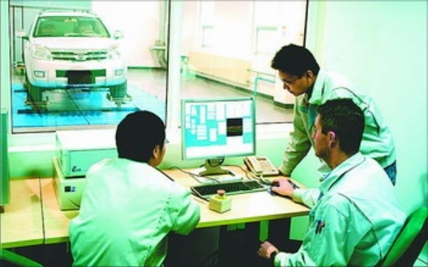 保定长城汽车公司,科技人员在进行“四通道”道路模拟实验检测。长城公司始终重视创新研发,目前长城技术研究院具备了皮卡、SUV、MPV、轿车四大体系以及动力总成的开发设计能力,可同时展开十多个车型的同步开发。