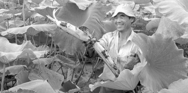 山东淄博市周村区蔬菜局提供“二氧化碳秸秆生物反应堆”新技术支持,淄博萌山湖秸秆养藕有限公司实行公司化管理,周村区农民利用“山旱田”等贫瘠土地发展秸秆养藕,北京、天津等地蔬菜经销商与农民签订收购合同。农民应用新技术种植的“有机藕”一亩地每年可增收近万元,农业产业化和定单农业在淄博市周村区得到良好发展。图为农民在采藕。孙德志摄