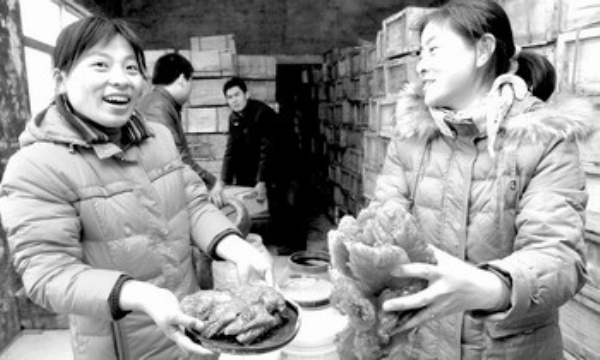 12月3日,山东沾化县冯家镇王尔庄海蜇批发市场业户付义霞(左)在向客商介绍刚从国外运回的海蜇。经过十余年发展,王尔庄海蜇批发市场已成为全国最大的海蜇批发市场,年交易额超过20亿元。李树贵摄