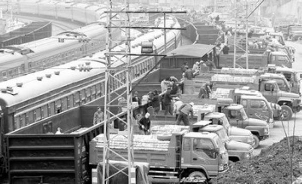 12月18日,工人把火车上的砖卸到汽车上。 陕西省宁强县为解决受灾群众建房建材紧张问题,专门安排500万周转金,积极从咸阳、渭南等地通过铁路、高速公路为灾区调运砖、水泥、钢材等急需建材。 新华社记者 丁海涛摄