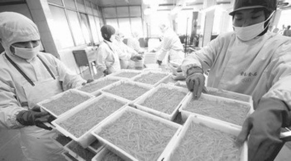 12月18日,山东潍坊金椿食品有限公司工作人员在加工蔬菜制品,这些蔬菜全部是通过保护价格从菜农手中收购的。 近年来,山东潍坊市鼓励蔬菜种植户与蔬菜深加工企业签订种植合同,发展“订单式”种植模式,按照保护价格收购农户种植的蔬菜,有效保障了菜农的利益。 新华社记者 李晓果摄