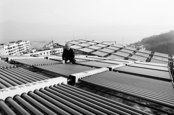 湖北省秭归县通过禁止单位使用燃煤锅炉,积极引导使用太阳能等清洁能源,保护三峡库区的生态环境。截至目前,该县1.8万户居民共安装太阳能热水器近万台,家庭太阳能使用率达到50%以上。12月24日,一名工人正在秭归县新县城某宾馆楼顶检查太阳能集热管。郑家裕摄(新华社发)