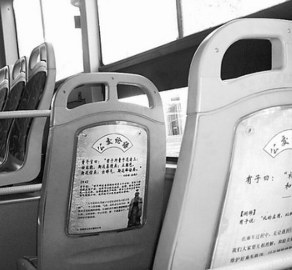 近日,济南公交推出了“论语进车厢活动”。图为张贴在座椅后的“公交版”《论语》。孔庆平摄