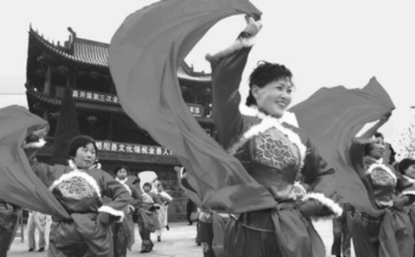 | 上图 1月1日,地震灾区陕西省略阳县城的群众在东门楼广场载歌载舞欢度新年。新年伊始,略阳县城乡一派祥和新气象,各项恢复重建快速推进,市场供应平稳。 新华社记者 陶 明摄 |