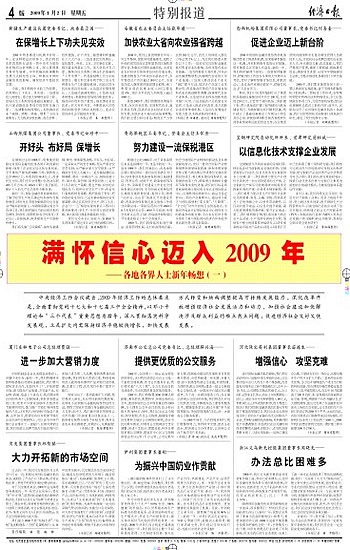 随着国际金融危机对我国影响的进一步加深,很多像我们一样的民营企业面临着生存压力。新的一年,我想企业界除了要拿出直面困难的信心和勇气,更要加强团结互助。2009年是新光集团整合资源和把握机会的一年。全球购买力的下滑,对所有消费品行业造成了不利影响,但也为我们进行业务重组、完善上下游一体化业务链提供了绝佳的战略机遇。我们一方面将下大力气“修炼内功”,建立和完善公司治理机制,强化职业化、专业化的团队建设,打造学习型企业,建立健全绩效考核体系;另一方面,将着力寻找、挖掘国内外各种有利资源,按照升级转型的需求进行整合,进一步推动产业模式的创新和发展。此外,作为民营企业,我们还应该自觉地担负起社会责任,为社会的安定和谐多做贡献。