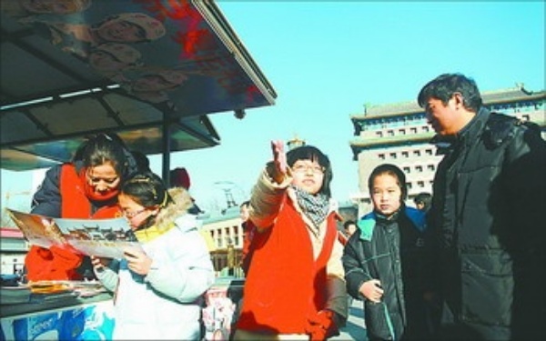 | 1月1日,北京前门大街,志愿者为外地游客介绍旅游景点。 本报记者 赵 晶摄 |