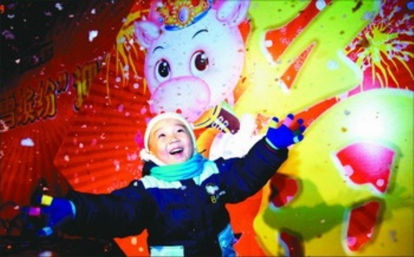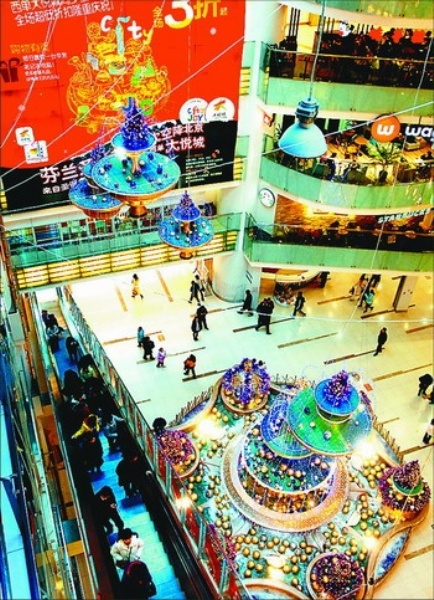 | 装饰一新的北京西单大悦城,元旦期间推出多种促销活动,吸引了众多消费者。 李树贵摄 |