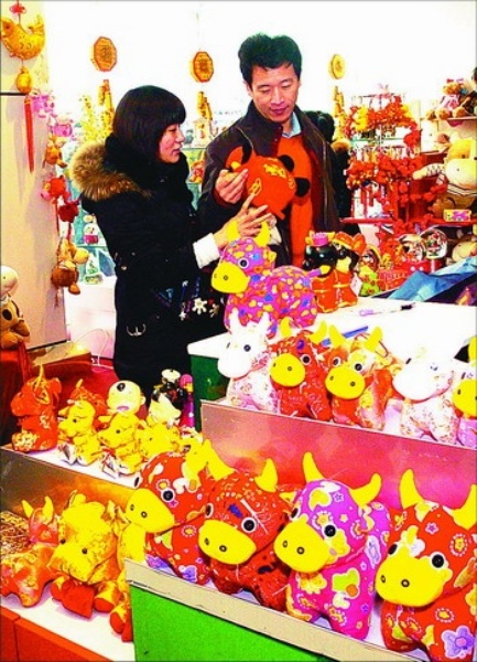 | 1月2日,北京君太百货商场的柜台前,人们在选购农历牛年吉祥礼品。