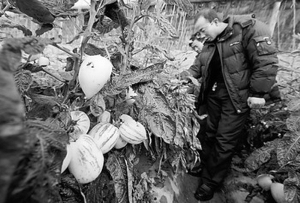 1月2日,甘肃省张掖市高台县科技特派员闫存全(前)在合黎乡六三村一户农民的日光温室内查看人参果生长情况。甘肃省张掖市高台县的农业科技人员为农户排忧解难,帮助农民增收。新华社记者 韩传号摄