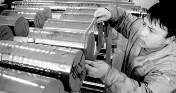 江西晶科能源有限公司的员工正在检测单晶硅棒质量。该公司重视产品研发,提升市场竞争力,已成为国内最具规模的太阳能单晶硅生产基地之一。卓忠伟摄 (中经网供图)