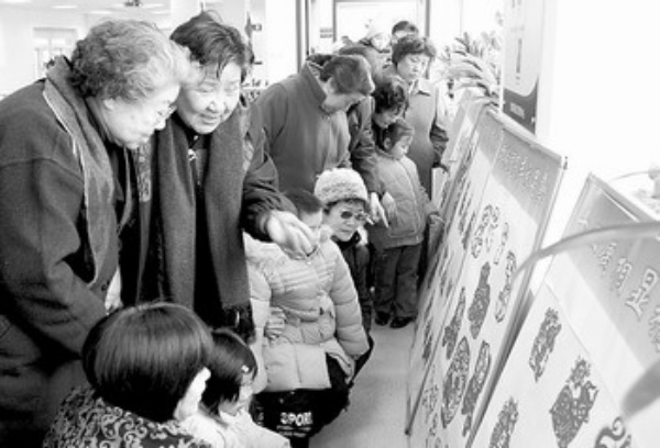 青岛市市南区社区的老人儿童在看剪纸。刘成摄