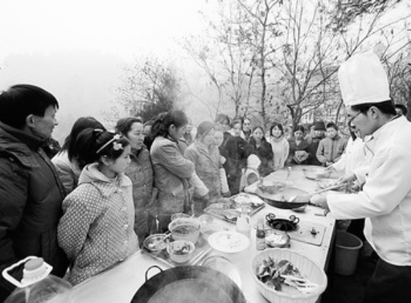 1月8日,培训老师在重庆市万州区甘宁镇兴国村为返乡农民工进行厨艺示范。 重庆市万州区近期免费为返乡农民工提供厨艺、电焊等各类技能培训,全区已培训返乡农民工3万多人次。 新华社记者 周衡义摄